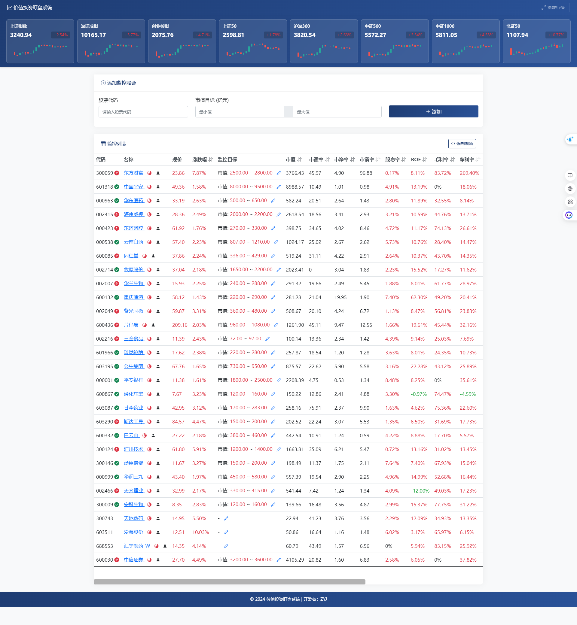 • 多维度指标展示PE、PB、ROE等价值投资指标